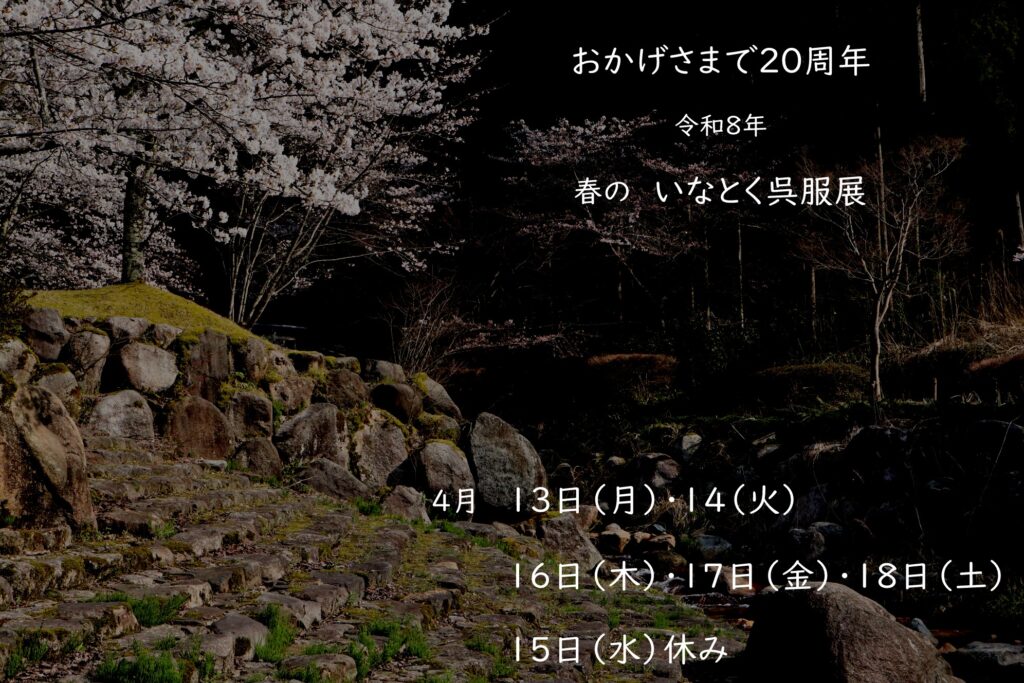 2026/04/02 お知らせ 令和8年 おかげさまで20周年展 平成18年にオープンしたいなとく呉服店は、おかげさまでは20周年をむかえることができました。 これもひとえにご来店いただきました皆様の支えがあったからこそと深く感謝しております。 今後もよろしくお願い申し上げます。 (いなとく五代目)